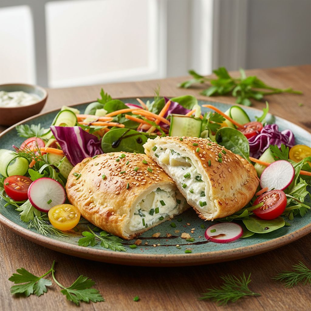 / Bunte Salatplatte mit gebackener Frischkäse-Kartoffeltasche
