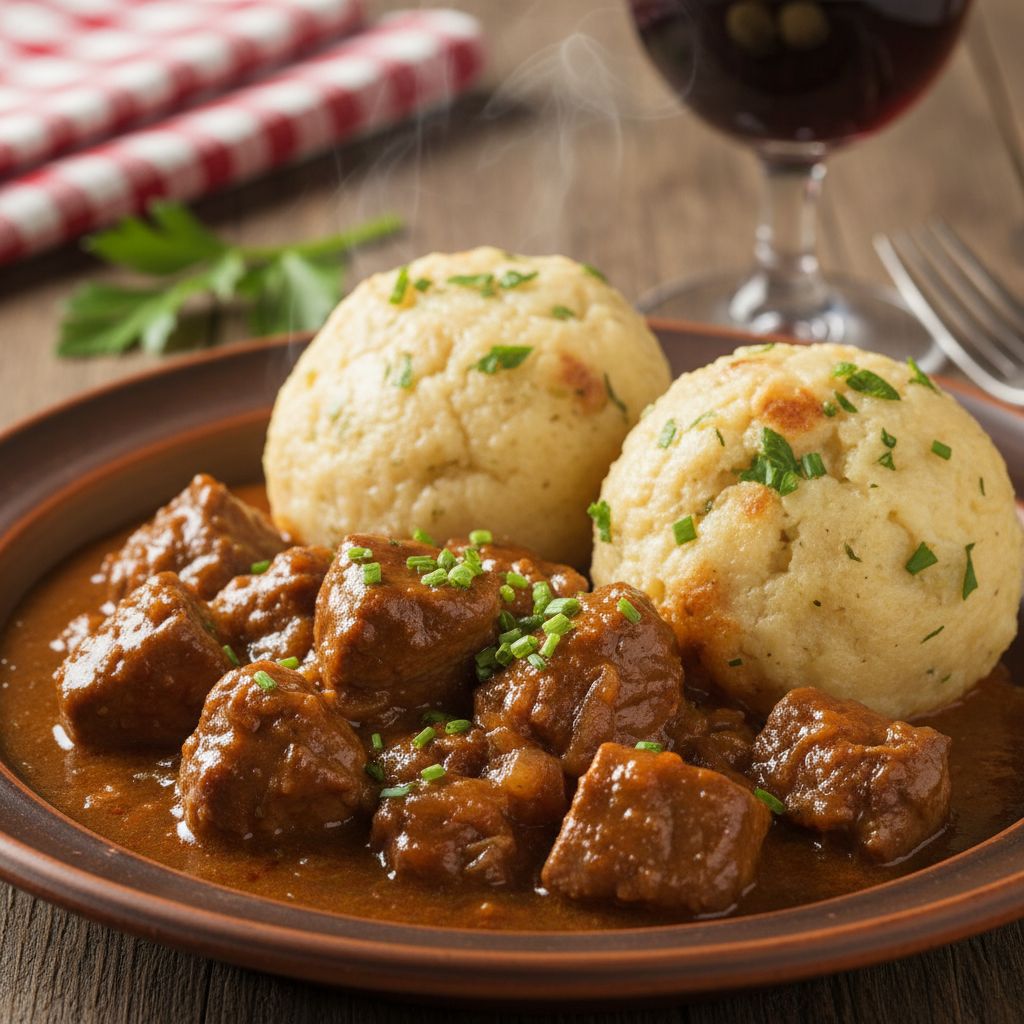 Zarter Kalbsgulasch in kräftiger Soße mit Semmelknödel